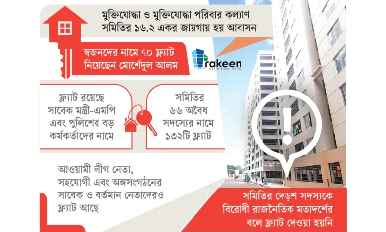চুক্তি অনুযায়ী, প্রকল্পের মোট ফ্ল্যাটের ৪৩ শতাংশ সমিতির, বাকি ৫৭ শতাংশ ডেভেলপার কোম্পানির। সেই হিসাবে সমিতির নামে আছে ৮৭০টি ফ্ল্যাট, যার সবকটি পাওয়ার কথা সমিতির সদস্য মুক্তিযোদ্ধা ও তাদের পরিবারের। তবে অভিযোগ উঠেছে, ৮৭০টি ফ্ল্যাটের অর্ধেকই রয়েছে প্রভাবশালীদের দখলে। এর মধ্যে সমিতির সাধারণ সম্পাদক মোর্শেদুল আলম ও তার স্বজনদের নামেই আছে ৭০টি ফ্ল্যাট। এগুলো কবজায় রাখতে পতিত সরকারের মন্ত্রী-এমপিসহ প্রশাসনের অনেককেও তিনি ফ্ল্যাট দিয়েছেন বলে অভিযোগ রয়েছে।