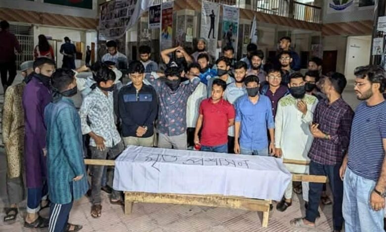 বরিশাল বিশ্ববিদ্যালয় প্রশাসনকে ‘মৃত’ ঘোষণা করে কফিন মিছিল শিক্ষার্থীদের