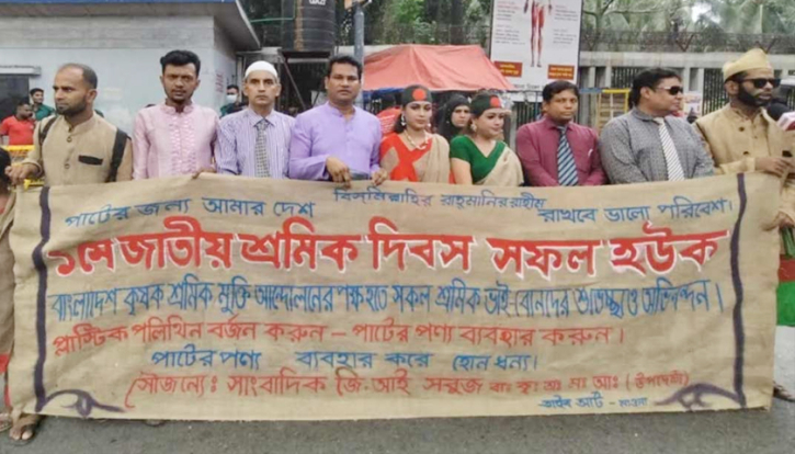 প্লাস্টিক পলিথিন বর্জন করে পাটের তৈরি পণ্য ব্যবহারের আহ্বান জানিয়ে মে দিবসে ভিন্নধর্মী আয়োজন করেছে বাংলাদেশ কৃষক শ্রমিক মুক্তি আন্দোলন।