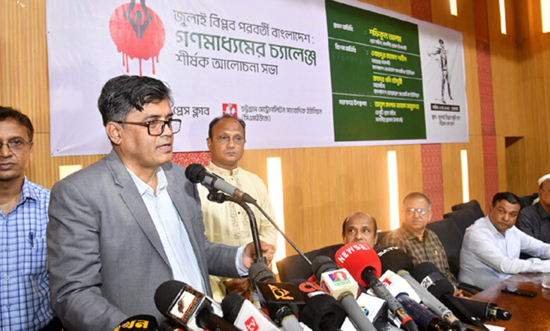 শুক্রবার চট্টগ্রাম প্রেস ক্লাবে আয়োজিত ‘জুলাই বিপ্লব পরবর্তী বাংলাদেশ: গণমাধ্যমের চ্যালেঞ্জ’ শীর্ষক আলোচনা সভায় প্রধান অতিথির বক্তব্যে তিনি এসব কথা বলেন।