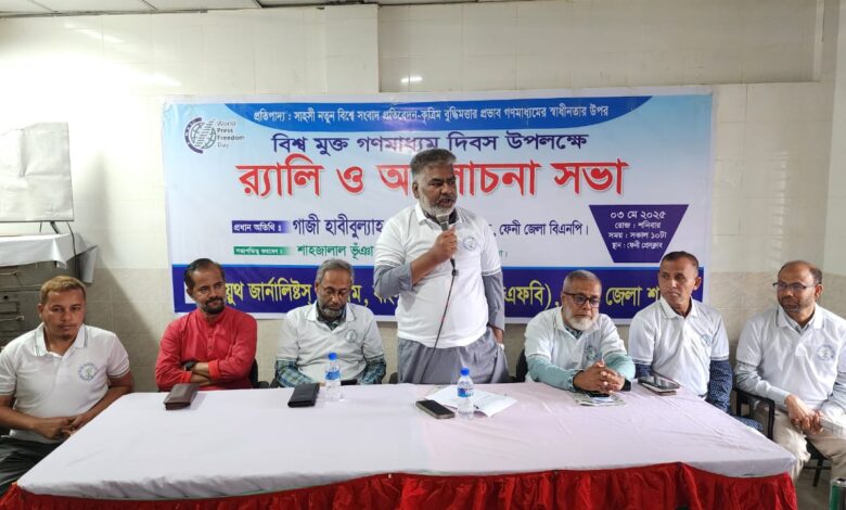 ফেনীতে বিশ্ব মুক্ত গণমাধ্যম দিবসে ৩ মে শনিবার সকালে ফেনী প্রেসক্লাব মিলনায়তনে আলোচনা সভা অনুষ্ঠিত হয়েছে। ইয়ুথ জার্নালিস্ট ফোরাম ফেনী জেলা শাখার উদ্যোগে র্যালি ও আলোচনা সভায় প্রধান অতিথি ছিলেন ফেনী জেলা বিএনপির যুগ্ম আহবায়ক গাজী হাবীবুল্যাহ মানিক। এতে মূল প্রবন্ধ উপস্থাপন করেন ওয়াইজেএফবি ফেনী শাখার সাধারণ সম্পাদক সোলায়মান হাজারী ডালিম।