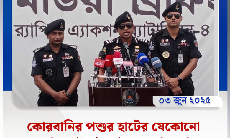 র্যাব-৪-এর অধিনায়ক লে. কর্নেল মো. মাহবুব আলম মঙ্গলবার (৩ জুন) গাবতলীতে এক সংবাদ সম্মেলনে জানিয়েছেন, পশুর হাটে নিরাপত্তা ব্যবস্থা জোরদার করা হয়েছে এবং ঈদুল আজহা উপলক্ষে পশু পরিবহনে কঠোর ব্যবস্থা নেওয়া হবে। তিনি বলেন, এক হাটের পশু অন্য হাটে নিয়ে গেলে কিংবা পশুর হাটকেন্দ্রিক চাঁদাবাজি করলে দ্রুত আইনগত ব্যবস্থা নেওয়া হবে।