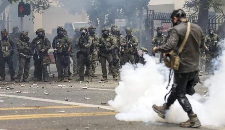 বিক্ষোভকারীদের হাতে মেক্সিকান পতাকা দেখা গেছে, যা মার্কিন অভিবাসন কর্তৃপক্ষের বিরুদ্ধে প্রতিবাদের প্রতীক। গভর্নর গ্যাভিন নিউসম ন্যাশনাল গার্ডের মোতায়েনকে ‘অবৈধ’ উল্লেখ করে তাদের প্রত্যাহারের আহ্বান জানিয়েছেন। তিনি হোয়াইট হাউজকে স্থানীয় কর্তৃপক্ষের আইন-শৃঙ্খলা রক্ষার দায়িত্ব ফিরে দেওয়ার অনুরোধ করেছেন।