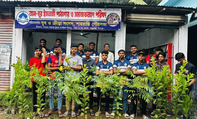 আসুন পরিবেশের ভারসাম্য রাখতে বেশি করে গাছ লাগাই এই স্লোগানকে সামনে রেখে শাহরাস্তি পৌরসভা ১১ নং ওয়ার্ড সাহেব বাজার আন- নূর ইসলামী পাঠাগার ও সমাজ কল্যাণ পরিষদের উদ্যোগে শিক্ষার্থী ও পথচারীদের মধ্যে ১০ জুলাই বৃহস্পতিবার বিকেলে তিন ধাপে শতাধিক গাছের চারা বিতরণ কার্যক্রম উদ্বোধন করা হয়।