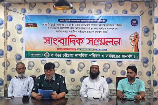 ৮ দফা দাবিতে আগামী ১৩ অক্টোবর (সোমবার) বান্দরবানে সকাল-সন্ধ্যা সর্বাত্মক হরতালের ডাক দিয়েছে পার্বত্য চট্টগ্রাম নাগরিক পরিষদ। বৃহস্পতিবার (৯ অক্টোবর) সকালে বান্দরবানের একটি স্থানীয় হোটেলে আয়োজিত সংবাদ সম্মেলনে এই ঘোষণা দেন সংগঠনটির কেন্দ্রীয় চেয়ারম্যান কাজী মো. মজিবর রহমান।