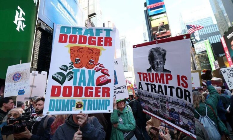 নিউইয়র্কের বিখ্যাত টাইমস স্কোয়ারে সকালেই হাজারো মানুষ জড়ো হন। রাস্তাঘাট ও সাবওয়ের প্রবেশমুখও ছিল উপচে পড়া ভিড়ে পরিপূর্ণ। অনেকেই হাতে প্ল্যাকার্ড ধরে রেখেছিলেন। এর মধ্যে ‘গণতন্ত্র, রাজতন্ত্র নয়’ এবং ‘সংবিধান ঐচ্ছিক কোনও বিষয় নয়’ লেখা পোস্টারও ছিল।